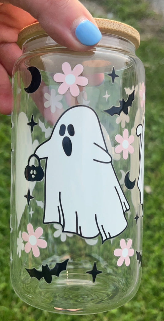 Ghost w/Flowers, bats & moons - 16 oz decal glass cup